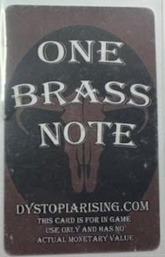 Once you’ve attended your first Dystopia Rising Live event, you might have noticed a few players with different forms of Currency cards than the ones you are used to seeing. While the trusty BRASS NOTE is our currency of choice in DR:TX, each chapter across the nation can have their own currency. Over the years of games opening and closing or chapter ownership changing, there are some chapters that have multiple versions of currencies that have been used over the history of their game. There’s even some currency floating around out there from games that are no longer around, and even some ultra-rare currencies from games that never even happened. Some players even value some other types of collectables, with funny things like wall stubs, flowers, chits, or fake player-made currencies in their collection!