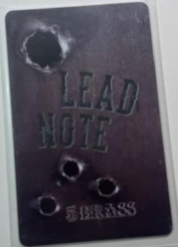 The second generation of Texas currency was usually printed on thicker plastic. There are several color variations in this generation, including a dark red, light brown, light yellow, and medium brown variant of the Brass Note, and a dark and light variant of the Lead Note. The old Lead Note only had 4 bullet holes and used a different curved pattern for the font. The Tin Note has two different coloration - a dark and light, and there is a thick plastic version that is identical to the current thin plastic printing. There are two known misprints in this era, a 2nd edition Brass Note and Tin Note that are printed upside down on the back side. There is a large quantity of this misprinted Brass and Tin in circulation, but they are otherwise the standard coloration. These are still legal tender in game but will eventually be retired.